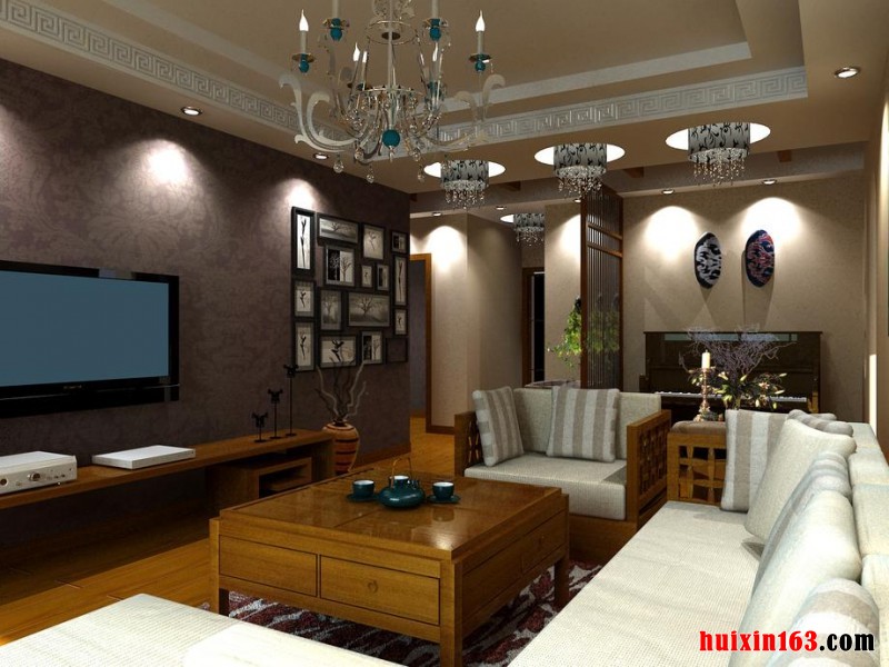 在电视背景墙上采用深色的具有明显的东南亚民族特色的装饰壁画,下面摆放一个加长的实木的电视柜,柜子的腿部采用了非常简洁的具有吉祥寓意的结构构造,搭配实木的地板和实木的方形的茶几,给人一种非常简约质朴的感觉。在客厅的顶面上悬挂着有限的枝形吊灯,上面漂亮的蜡烛的造型给人一种非常优雅华贵的感受。