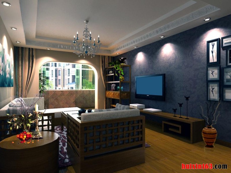 在电视背景墙上采用深色的具有明显的东南亚民族特色的装饰壁画,下面摆放一个加长的实木的电视柜,柜子的腿部采用了非常简洁的具有吉祥寓意的结构构造,搭配实木的地板和实木的方形的茶几,给人一种非常简约质朴的感觉。在客厅的顶面上悬挂着有限的枝形吊灯,上面漂亮的蜡烛的造型给人一种非常优雅华贵的感受。