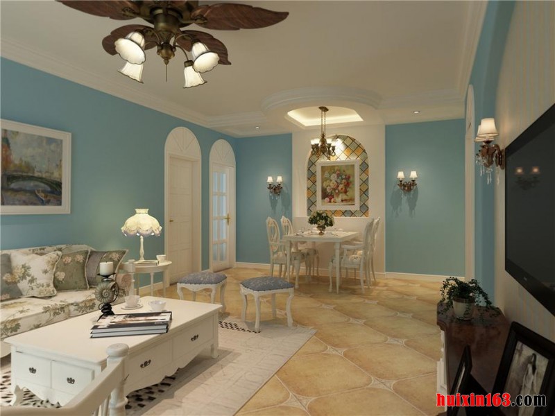 在客厅的顶面上采用一个椰子树叶造型的吊扇灯,营造出非常唯美清新的感受。搭配墙面上的蓝白色的色彩的装饰,以及一些优美的拱门的造型,条纹的装饰,墙面上安装的造型古朴优雅的墙灯,给人一种夏日度假般的清凉感受。地面上的浅黄色的仿古地砖搭配白色的线条柔美简洁的欧式的家具,让房间内体现出夏日的浪漫情怀。