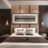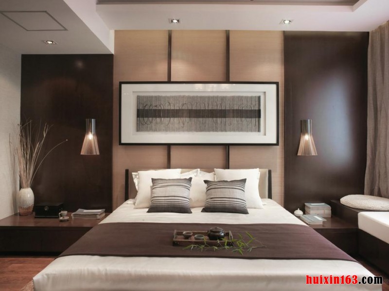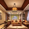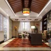 在书房的顶面上采用胡桃木色的斜梁设计出一个尖顶的拱顶的造型,在顶面的中央的位置采用两根黑色的沙梨木作为装饰主梁,在顶面中央的位置悬挂着一盏橘红色的加厚的月亮灯,搭配黑色的镂空的框架,营造出非常柔美温馨的意境。在地面上采用仿实木花纹的地毯,墙面上装饰着清新幽静的水墨画,加之一些陶瓷用品和摆件的摆放,营造出一股浓重的书香之气。