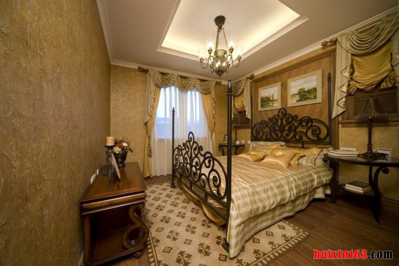 在客厅的顶面上采用一些白色的石膏板设计出方形的横梁的结构,空间的设计更加接近自然质朴的装饰风格。在墙面上设计出一个虚拟壁炉的造型充当电视背景墙,非常的优雅华美,在壁炉的上边摆放一些金色的装饰品还有一个深色的实木的造型的闹钟,墙面上是金黄色的边框的镜子,搭配浅灰色的背景墙,给人一种非常简洁明快的感觉。