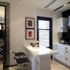 在书房的墙面上安装了一个超大的博古架,在上面摆放满了各种书籍和摆件,明亮的灯带环绕在博古架的背景墙上,营造出温馨典雅的氛围,同时取用书籍和观赏摆件与收藏品也更加的方便。在书房的顶面上是一些明亮的射灯,地面上的深色的瓷砖和深色的桌椅以及博古架形成了很好的呼应的关系。
