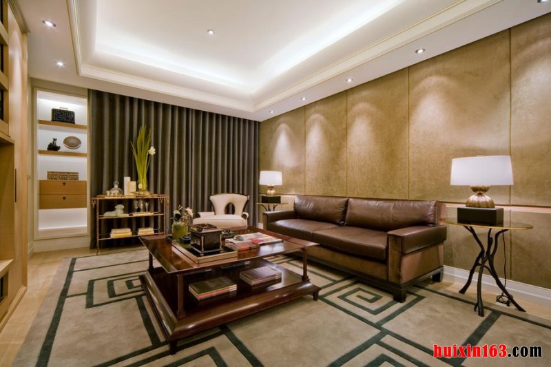 在客厅的顶面上装饰着一圈漂亮的凹凸有致的石膏造型,在顶面上均匀的分散着单眼射灯和牛眼射灯,打造出一派整洁温馨居室氛围。在地面上铺设的深色的具有现代艺术气息的花纹的地毯,搭配造型优雅的半围合结构的沙发,和中央一个超大的方形的茶几,给人一种非常典雅温馨的感觉。