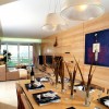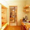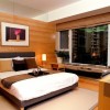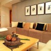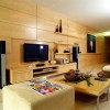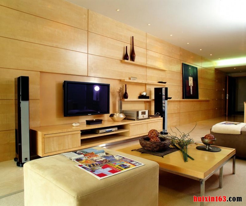 在客厅的电视背景墙和玄关的墙面上大面积的采用长条状的实木板装饰,营造出非常清新雅致的氛围。在摆放电视的位置空出一部分,造成一种视觉上的进深感,在墙面上还布置一些同样颜色的实木的隔板,可以用来摆放一些小的摆件或是一些图画作品,与地面上摆放的清新的实木地板形成呼应。在顶面上是一圈排列均匀的射灯,给人一种非常温馨雅致的感受。